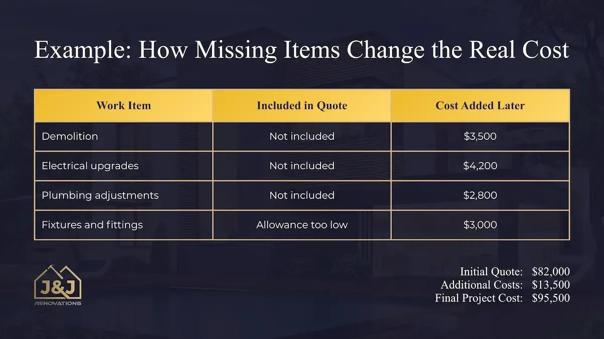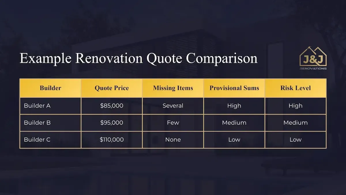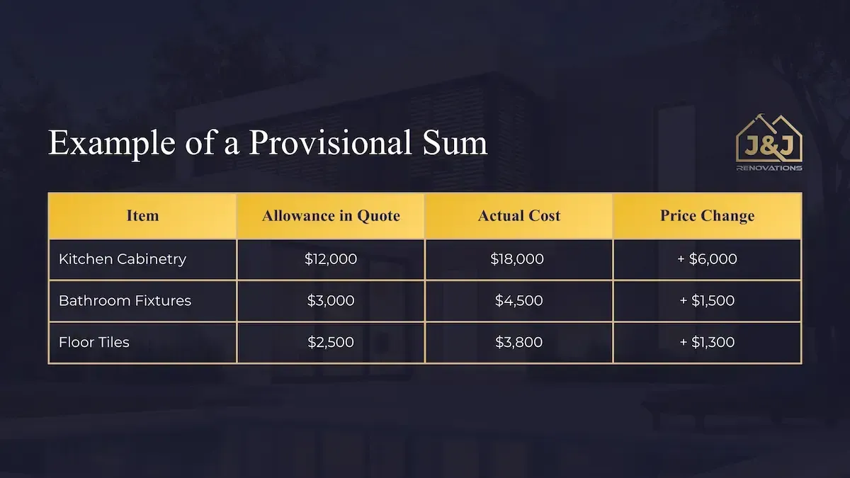 Provisional sums are common in renovation projects, but they should be used carefully. Large allowances or vague descriptions can make the quote look cheaper while leaving the final price uncertain.